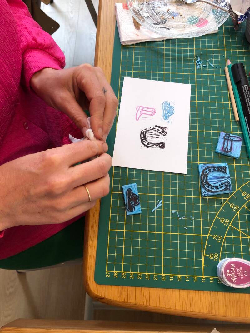 “Wat een leuke workshop! We werden hartelijk ontvangen door Tessa, en onder het genot van thee met lekkers kregen we duidelijke en inspirerende uitleg. En daarna zelf aan de slag, het leukste deel! Tessa gaf tips en tricks waar nodig, met haar grafisch vormgevers-oog maar wel zo dat je ontwerp echt van jou is! Ze laat je kennis maken met verschillende materialen en zorgt voor goed gereedschap en ruime werkplekken. Een aanrader dus! Ik heb mijn stempel al veel gebruikt thuis. Ook een leuke workshop voor creatieve/handige tieners.”